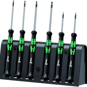 Kvalitets Wera Micro skruetrækkersæt til finmekaniske skrueforbindelser. Kuglehovedprofil: Via den kugleformede spidsprofil er det muligt at svinge værktøjsaksen i forhold til skrueaksen, således at man derved kan skrue “om hjørner”. Ved at støtte hånden på den drejelige kappe og via lyndrejezonen nedenfor drejekappen er det muligt at snurre lynhurtigt rundt, ingen tidskrævende tagen fat på ny nødvendig mere. Kraftzone med integrerede bløde zoner til overførsel af store løsnings- og spændingsmomenter. Præcisionszone direkte over klingen til den rigtige drejevinkel ved justeringsarbejde. Wera Black Point-spidsen giver præcision og optimeret korrosionsbeskyttelse.